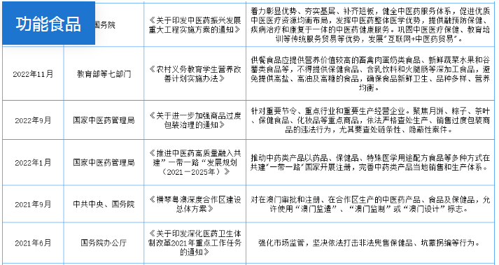 近年来,在中国功能食品行业受到各级政府的高度重视和国家产业政策的重点支持。国家陆续出台了多项政策,鼓励功能食品行业发展与创新,《计量发展规划(2021-2035年)》《关于印发中医药振兴发展重大工程实施方案的通知》《农村义务教育学生营养改善计划实施办法》等产业政策为功能食品行业的发展提供了明确、广阔的市场前景,为企业提供了良好的生产经营环境。