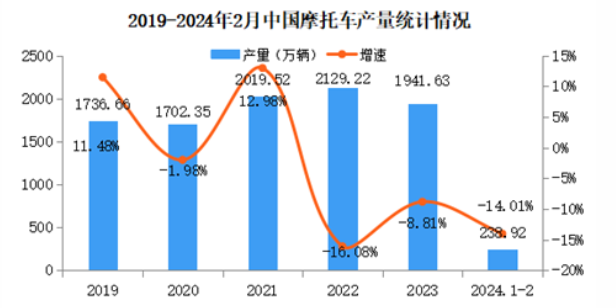 1-2月,全行业完成燃油摩托车产销203.8万辆和209.55万辆,同比增长13.4%和13.74%;电动摩托车产销35.13万辆和34.22万辆,同比下降64.21%和64.08%。1-2月,共产销摩托车238.92万辆和243.77万辆,同比下降14.01%和12.78%。其中,二轮摩托车产销209.01万辆和213.48万辆,同比下降14.83%和13.34%;大排量休闲娱乐摩托车(排量250cc以上,不含250cc)产销5.72万辆和6.31万辆,同比增长5.73%和10.31%。三轮摩托车产销29.91万辆和30.29万辆,同比下降7.8%和8.68%。