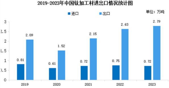 我国钛材加工工艺不断提升,在国际中的认可度有所提升,出口数量远大于进口数量,在中低端产品方面已能实现自给自足。据中国海关总署统计数据,2023年,各类钛材进口数量为7210吨,进口金额为6.07亿美元;钛材出口数量为27946吨,出口金额为7.71亿美元。