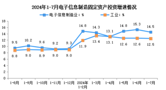 1-7月份,电子信息制造业固定资产投资同比增长14.5%,较1-6月份下降0.8个百分点,比同期工业、高技术制造业投资增速分别高2个和4.8个百分点。
