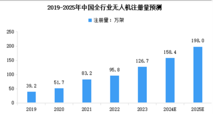 受益于行业发展及政策支持,中国无人机注册数量快速增加。截至2023年底,全行业注册无人机共126.7万架,比2022年底增长32.2%。今年上半年,新注册的无人机将近60.8万架,较去年年底增长了48%。2024年全年中国无人机注册量将达到158.4万架,2025年达到198万架。