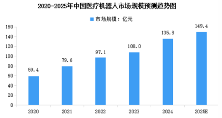 医疗机器人是指用于医疗诊断、治疗、康复、护理等领域的自动化设备。近年来,受益于政策扶持、老龄化催生的康复需求及手术精准化趋势,中国医疗机器人行业正处于高速发展期。2024年中国医疗机器人市场规模约为135.8亿元,近五年年均复合增长率达22.96%。2025年中国医疗机器人市场规模将增至149.4亿元。