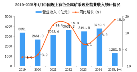 2025年1-4月,全国规模以上有色金属矿采选业营业收入1283.5亿元,同比增长18.0%;营业成本747.8亿元,同比增长7.2%;利润总额365.4亿元,同比增长47.8%。