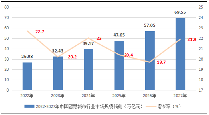 预测2022-2027年中国智慧城市行业市场规模增长率在19%以上,未来几年,行业市场规模将持续增长。预测2027年中国智慧城市行业市场规模达到69.55万亿元,行业市场发展前景较好。预测数据如下表所示: