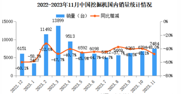 2023年11月销售各类挖掘机14924台,同比下降37%,其中国内7484台,同比下降48%;出口7440台,同比下降19.8%。