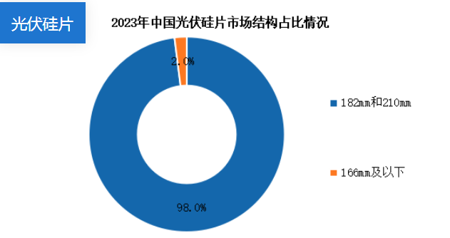目前,光伏硅片市场中,以大尺寸为主。2023年,182mm和210mm尺寸的硅片已成为市场主流,合计占比高达98%,而166及以下尺寸的硅片则逐渐退出主流市场,仅占2%。