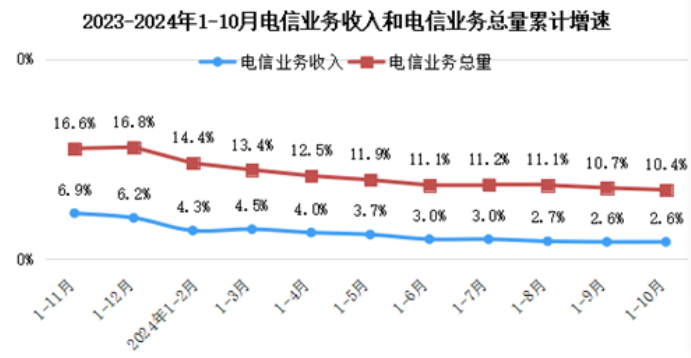 2024年前10个月,通信业整体运行平稳。电信业务收入保持正增长,新兴业务持续发挥拉动作用;5G、千兆光网、物联网等网络基础设施建设稳步推进,连接用户规模持续扩大,移动互联网接入流量较快增长。