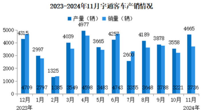 2024年11月,宇通客车销量3736辆,同比增长13.73%。2024年1-11月,宇通客车累计销量38303辆,同比增长20.42%。