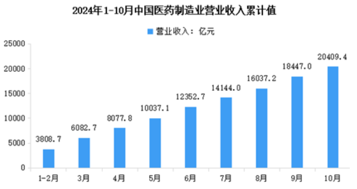 2024年1-10月,我国医药行业营业收入达到20409.4亿元,累计增长0.1%;行业实现利润总额2785.9亿元,累计减少1.3%。