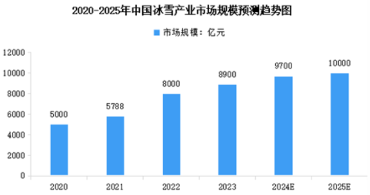 近些年,我国冰雪运动逐渐普及,冰雪旅游热度持续升温,“冷资源”正在加速转变为“热经济”,冰雪产业规模实现快速增长。中国冰雪产业规模从2019年的4200亿元迅速扩张到2023年的8900亿元,年均复合增长率达20.65%。2024年中国冰雪产业规模将达到9700亿元,2025年将突破万亿元。