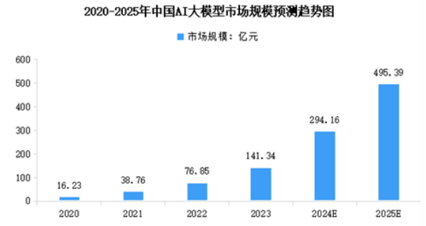 基于人工智能领域的深度学习模型,AI大模型能够处理大规模数据并具有更加精准的预测和决策能力,是实现人工智能商业化的关键,应用前景广阔。2023年中国AI大模型市场规模为141.34亿元,较上年增长83.92%。2024年中国AI大模型市场规模将达到294.16亿元,2025年达到495.39亿元。