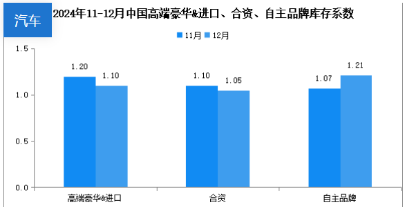 2024年12月,高端豪华&进口品牌库存系数为1.10,环比下降8.3%;合资品牌库存系数为1.05,环比下降4.5%;自主品牌库存系数为1.21,环比上涨13.1%。