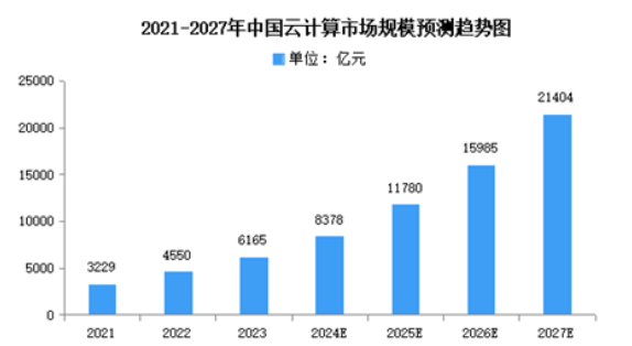 我国云计算市场保持较高活力。2023年我国云计算市场规模达6165亿元,较2022年增长35.5%,大幅高于全球增速。随着AI原生带来的云计算技术革新以及大模型规模化应用落地,我国云计算产业发展将迎来新一轮增长曲线,预计到2027年我国云计算市场规模将超过2.1万亿元。