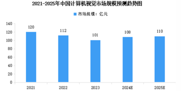 计算机视觉是一门研究如何使机器“看”的科学,是指用摄影机和电脑代替人眼对目标进行识别、跟踪和测量等机器视觉,并进一步做图形处理,使电脑处理成为更适合人眼观察或传送给仪器检测的图像。2023年计算机视觉市场市场规模达101.1亿元。2024年中国计算机视觉市场市场规模将达到108亿元,2025年达到110亿元。
