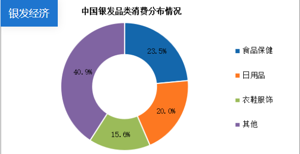 银发经济覆盖面广,现阶段相关产业主要集中在食品保健、日用品、衣鞋服饰等方面,市场份额分别占比23.5%、20.0%、15.6%。随着老年用品、智慧养老、康复辅助器具、抗衰老产业、养老金融产品、旅游服务等七大潜力产业的部署,未来我国银发品类消费分布将更加广泛。