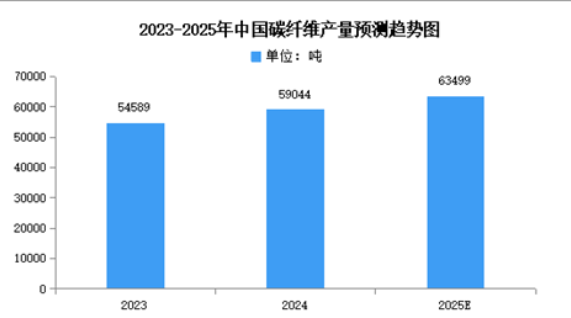 近年来,中国碳纤维产量呈现逐年上涨的趋势。2024年中国碳纤维产量59044吨,同比增长8.16%。2025年中国碳纤维产量将达到63499吨。