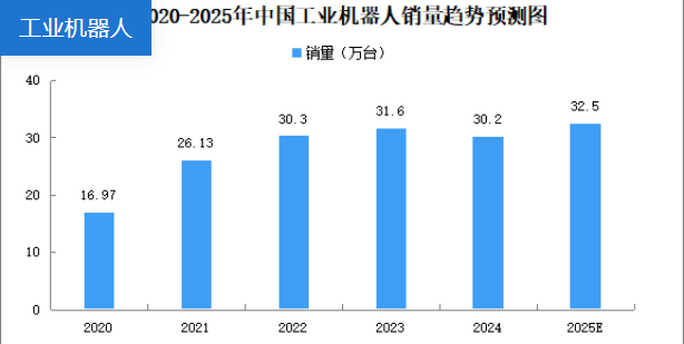 2024年中国工业机器人市场的销量约为30.2万台,与2023年相比有所下降,同比下降了4.50%。预计2025年中国工业机器人市场销量将达到32.5万台,同比增速约7.7%。