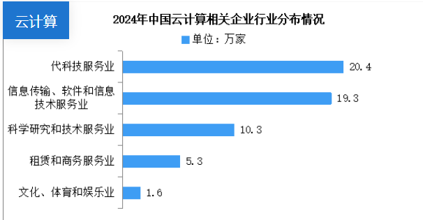 目前,我国在业存续的云计算相关企业中,归属现代科技服务业合计占比达65.5%。其中,归属信息传输、软件和信息技术服务业的企业最多,有20.4万家;归属科学研究和技术服务业的企业,有19.3万家,占比31.9%。