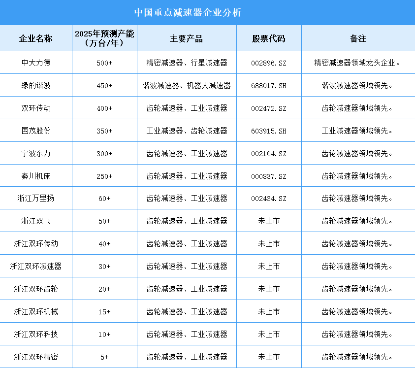 2025年,中国减速器行业将迎来快速发展,中大力德、绿的谐波、双环传动等龙头企业凭借技术优势和产能扩张,进一步巩固市场地位。随着工业自动化、机器人、新能源汽车等领域的快速发展,减速器企业在精密减速器、谐波减速器、齿轮减速器等关键领域取得显著进展,推动中国减速器产业的自主可控和高质量发展。已上市企业如中大力德(002896.SZ)、绿的谐波(688017.SH)等,凭借资本市场的支持,进一步扩大产能和技术优势,而未上市企业如恒丰泰、南通振康也在快速崛起,为中国减速器产业的国产化注入新动力。
