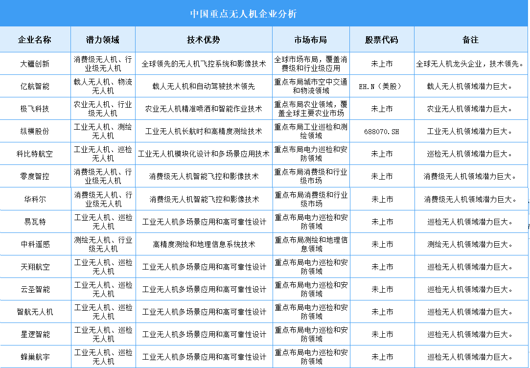 中国无人机行业潜力巨大,大疆创新、亿航智能、极飞科技等龙头企业在消费级、载人、农业等领域展现出强大的技术优势和市场潜力。随着工业级、农业级、测绘级等领域的快速发展,无人机企业在消费级无人机、工业无人机、测绘无人机等关键领域取得显著进展,推动中国无人机产业的自主可控和高质量发展。已上市企业如纵横股份(688070.SH)、华测导航(300627.SZ)等,凭借资本市场的支持,进一步扩大产能和技术优势,而未上市企业如大疆创新、极飞科技也在快速崛起,为中国无人机产业的国产化注入新动力。