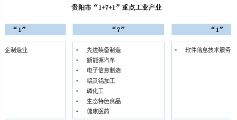 贵阳明确以工业为核心、多产业协同发展的战略方向,积极招引央企制造业,大力发展电子信息制造业、先进装备制造业、新能源汽车、磷化工产业、铝及铝加工产业、健康医药、生态特色食品、软件信息服务业等“1+7+1”重点产业。