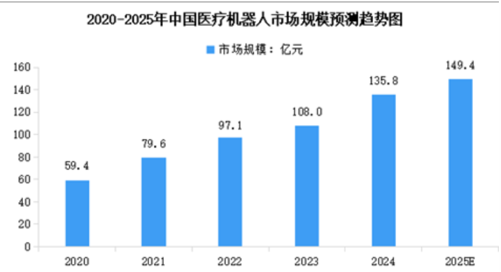 受益于政策扶持、老龄化催生的康复需求及手术精准化趋势,中国医疗机器人行业正处于高速发展期。2024年中国医疗机器人市场规模约为135.8亿元,近五年年均复合增长率达22.96%。2025年中国医疗机器人市场规模将增至149.4亿元。