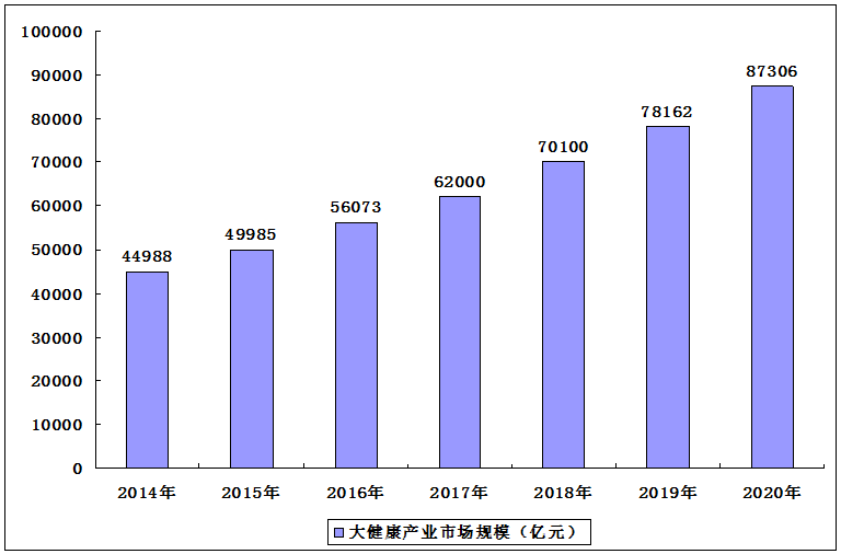 在政策支撑、人口老龄化带来需求、健康意识提升刺激消费等多重利好因素的推动下,我国大健康产业迎来发展。目前,虽然我国大健康产业发展仍处于初级阶段,但市场潜力巨大,规模不断增长。美国著名经济学家保罗·皮尔泽曾将大健康产业称为继IT产业之后的全球“财富第五波”,特别是对于中国来说,目前“健康中国”战略进一步提升了大健康产业的地位,未来大健康产业前景光明。2017年国内大健康产业总产值约6万亿元,2018年,这一规模已经超过7万亿元。国家卫健委政策研究室主任张毓辉此前表示,到2020年,大健康产业有望突破8万亿元的产业规模目标。到2020年底,全国大健康产业市场规模将达8.7万亿元。
