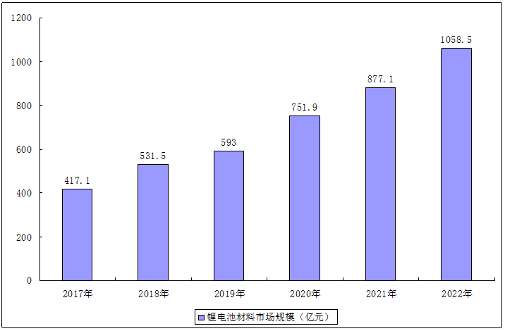 数据显示,我国锂电池正极材料市场规模由2017年417.1亿元增至2020年751.9亿元。2022年我国正极材料市场规模将突破千亿。