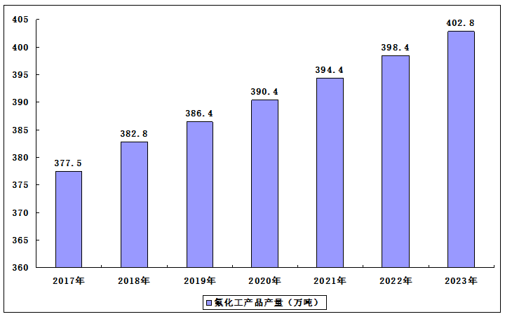 我国的氟化工行业高速发展,已成为国家战略新兴产业的重要组成部分,同时也是发展新能源等其他战略新兴产业和提升传统产业所需的配套材料,对促进我国制造业结构调整和产品升级起着十分重要的作用。数据显示,我国氟化工主要产品产量稳定增长,2021年达到约394.4万吨,预计2023年我国氟化工产品产量可达402.8万吨。